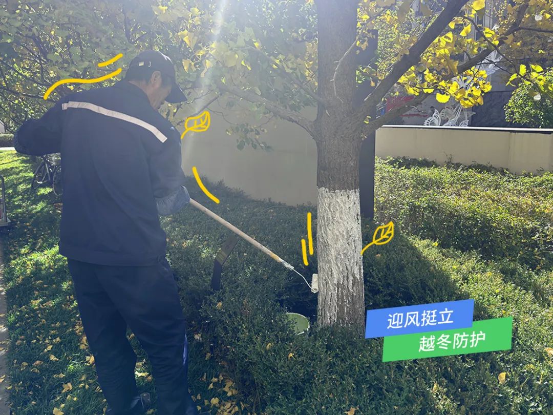 随着冬季气温降低,园区内的植物也进入了抵御严寒的关键时期。永升在管项目积极开展树木刷白、专业包裹保温等养护工作,增强树木的防虫和御寒能力,让花花草草们多重防护,安全过冬。