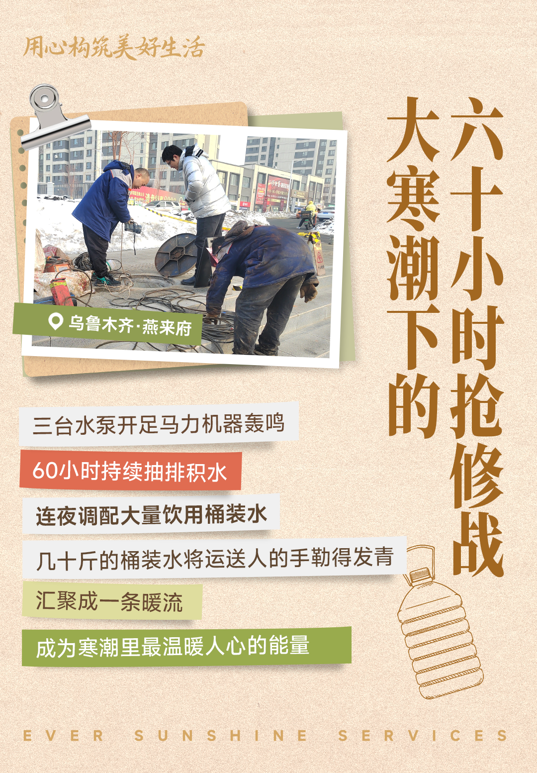 这是来自-18℃的乌鲁木齐的一个抢修现场。2月13日,大寒潮来袭,燕来府项目突发水管爆裂,16层以上住宅全部断水。