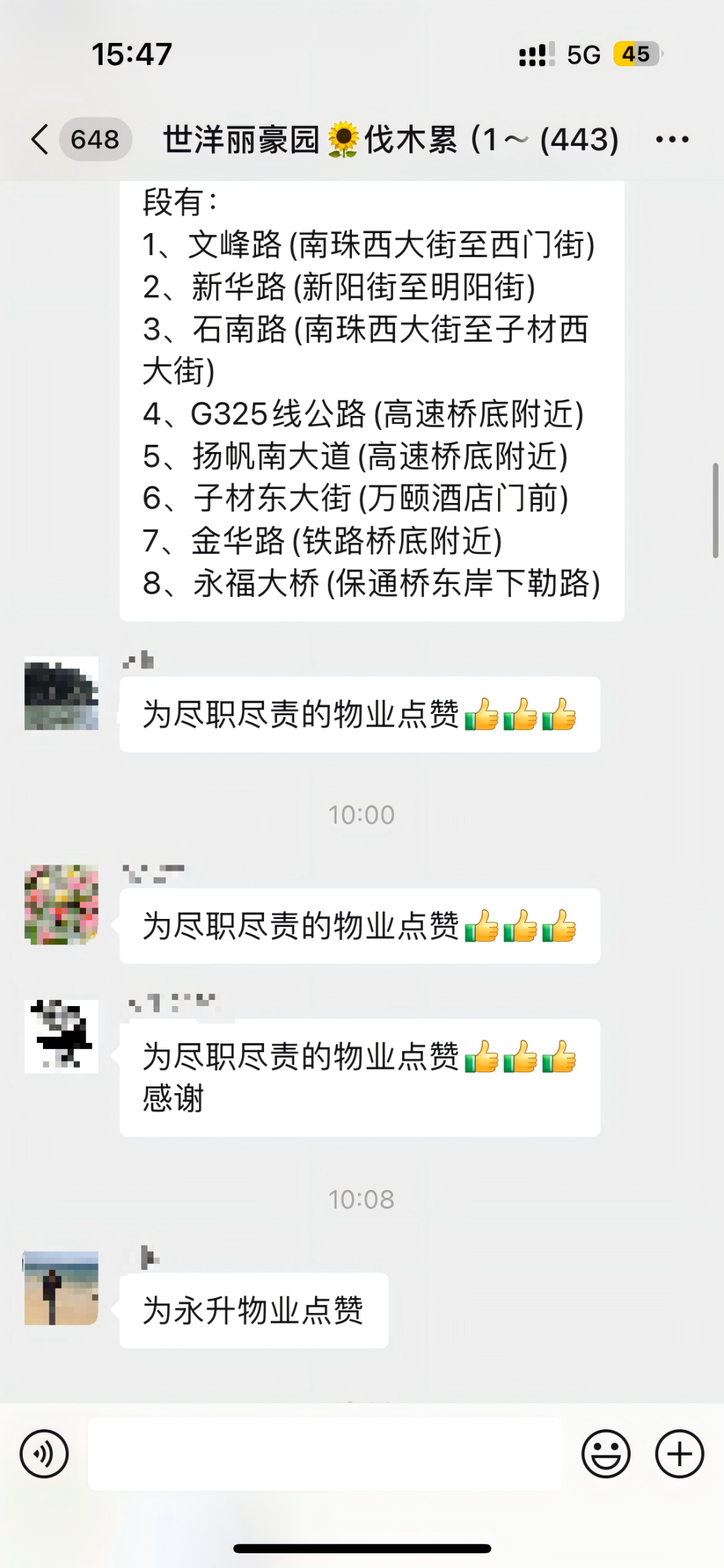 永升团队进场后,在社区党支部的带领下,建立“红色议事厅”联席会议制度,每季度物业经理牵头召开项目经理及小区党支部书记接待日,听取居民意见及客户心声,协调业主邻里纠纷;在红色议事厅机制下,党员带头主持调解,街道网格长提供法律支持,物业制定解决方案,全年化解各类居民重大纠纷10余起,为营造和谐社区,奠定良好基础。