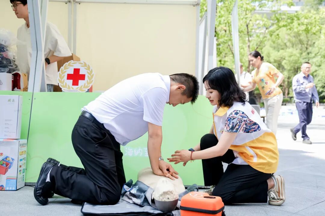 除了义卖与捐赠,集市里专门设置了一个急救展示区,专业人员现场演示AED设备使用技巧,讲解心肺复苏、气道梗阻的急救方法,大家听得认真、学得投入,有的还主动上前实操,反复确认动作细节。