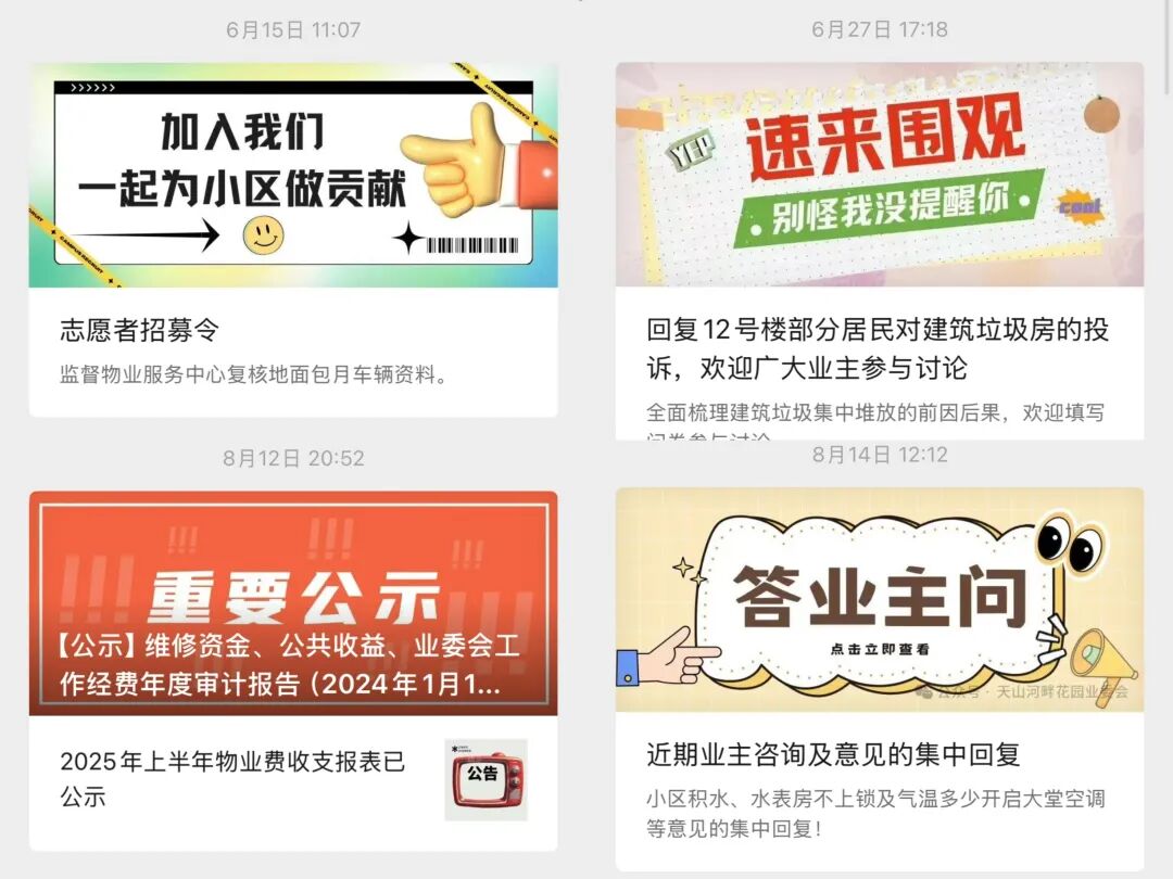 2024年,一个名为《天山河畔花园业委会》的微信公众号在业委会、业主代表圈里火了起来,因其内容“专业、直接、公开透明”,吸引了众多围观与点赞。点开公众号历史推送列表,文章内容涵盖小区物业管理的方方面面:小区维修基金、公共收益、业委会工作经费的年度审计报告,业主咨询意见的定期集中回复,小区停车月报,招募志愿者,热难点问题的群策群力以及对物业不同服务岗位的相关知识普及和行业深度思考……很难想象这样一个专业度高、公开透明、观点犀利的自媒体账号,竟然是由一个小区业委会独立运营。