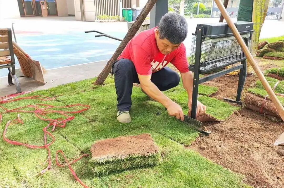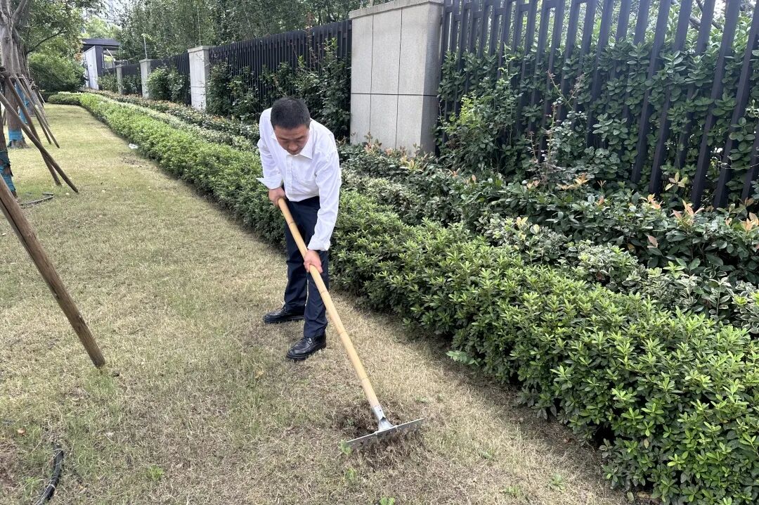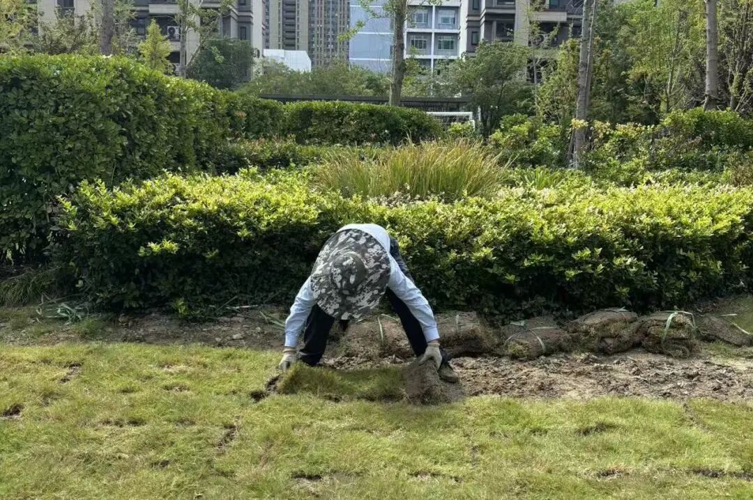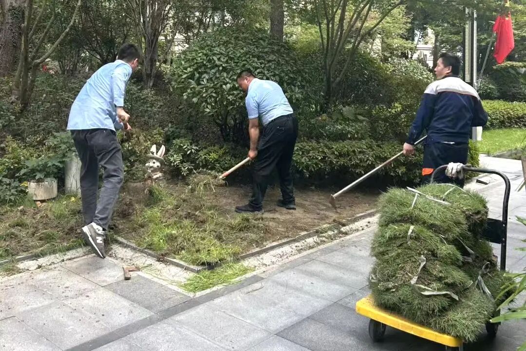 秋季,水分蒸发减缓,土壤温度适宜,是植物根系生长的黄金时期。针对园区内的“斑秃”草坪、裸露土壤以及不起眼的角落,永升服务绿化团队正开展一场“绿毯”修复行动,不是“哪里秃了补哪里”,而是运用科学的生态栽种流程:异物清理—翻耕松土—土壤育肥—植被选择—养护管理,并严格遵循“适地适树”原则,确保与原有植被和谐共生。
