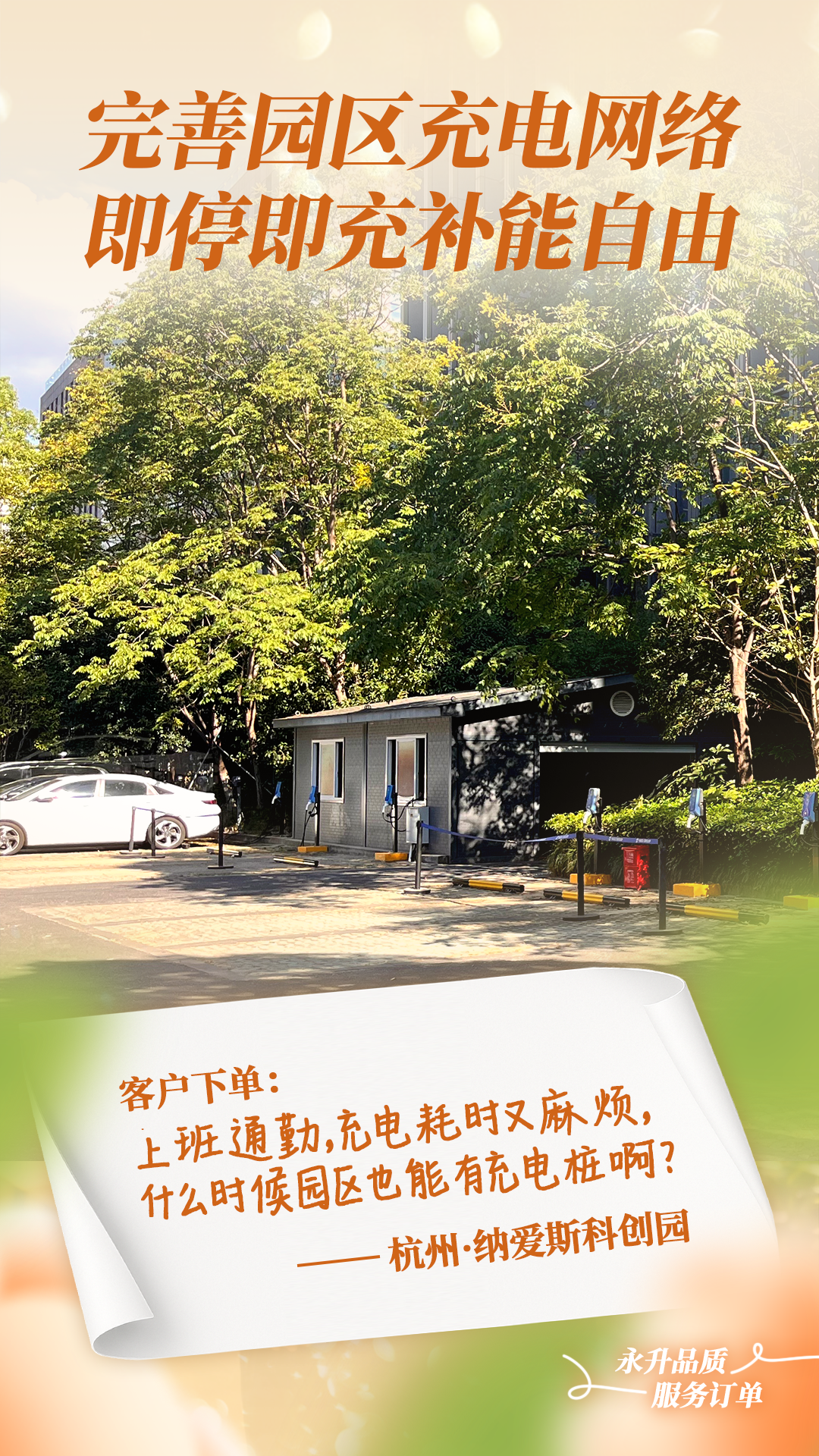 在杭州纳爱斯科创园,原有充电桩数量不足,故障率高且快充少,“找桩难、充电久”是新能源汽车通勤员工的高频痛点。永升服务在了解园区内员工这一反馈后,第一时间与甲方沟通,结合园区车位布局与用电负荷,制定充电桩增设方案:共新增十余个充电桩,同步优化充电网络,实现多区位覆盖。改造后,园区内充电排队现象得到了极大改善,物业服务满意度显著提升。