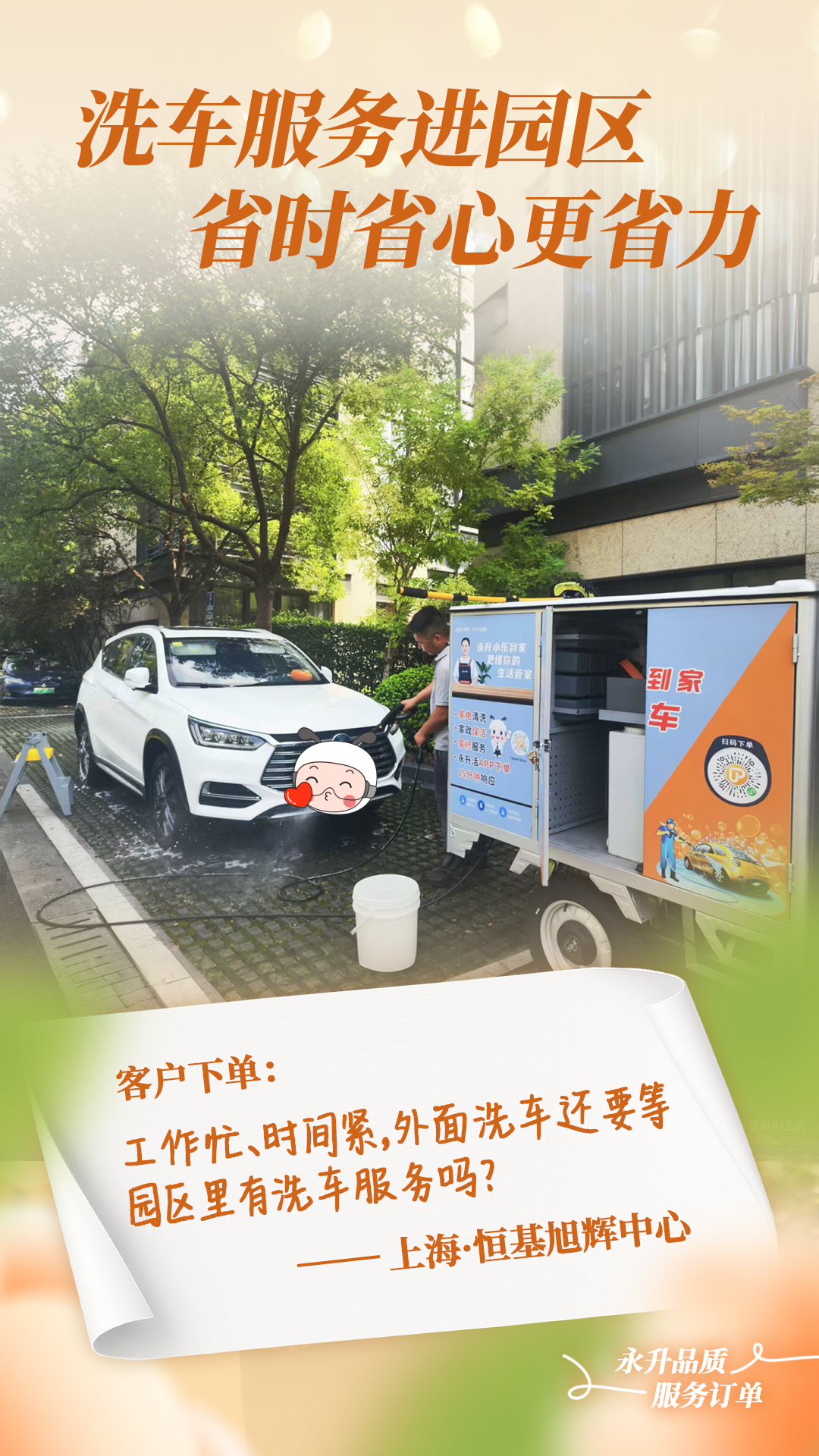 恒基旭辉中心项目团队在日常服务中发现,企业员工多有洗车需求,但因工作繁忙难抽时间外出;周边地库及洗车店不仅收费高,高峰期排队需1小时以上,“洗车难、洗车贵”成为普遍痛点。为切实解决这一痛点,物业中心积极响应,引入“永升小乐到家”洗车服务,专业工作人员会根据预约信息,携带专业设备,在园区指定区域提供上门洗车服务。一位企业客户表示:“上班时就能享受专业洗车服务,实惠又方便!”